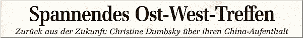 Exciting East-West-Meeting Back from the future: Christine Dumbsky about her China-Exhibiton Sommerach, it was an unusual cultural exchange: The Sommerach artist Christine Dumbsky attended an international exhibition in Tianjin/China. We were talking with her about her journey. |
